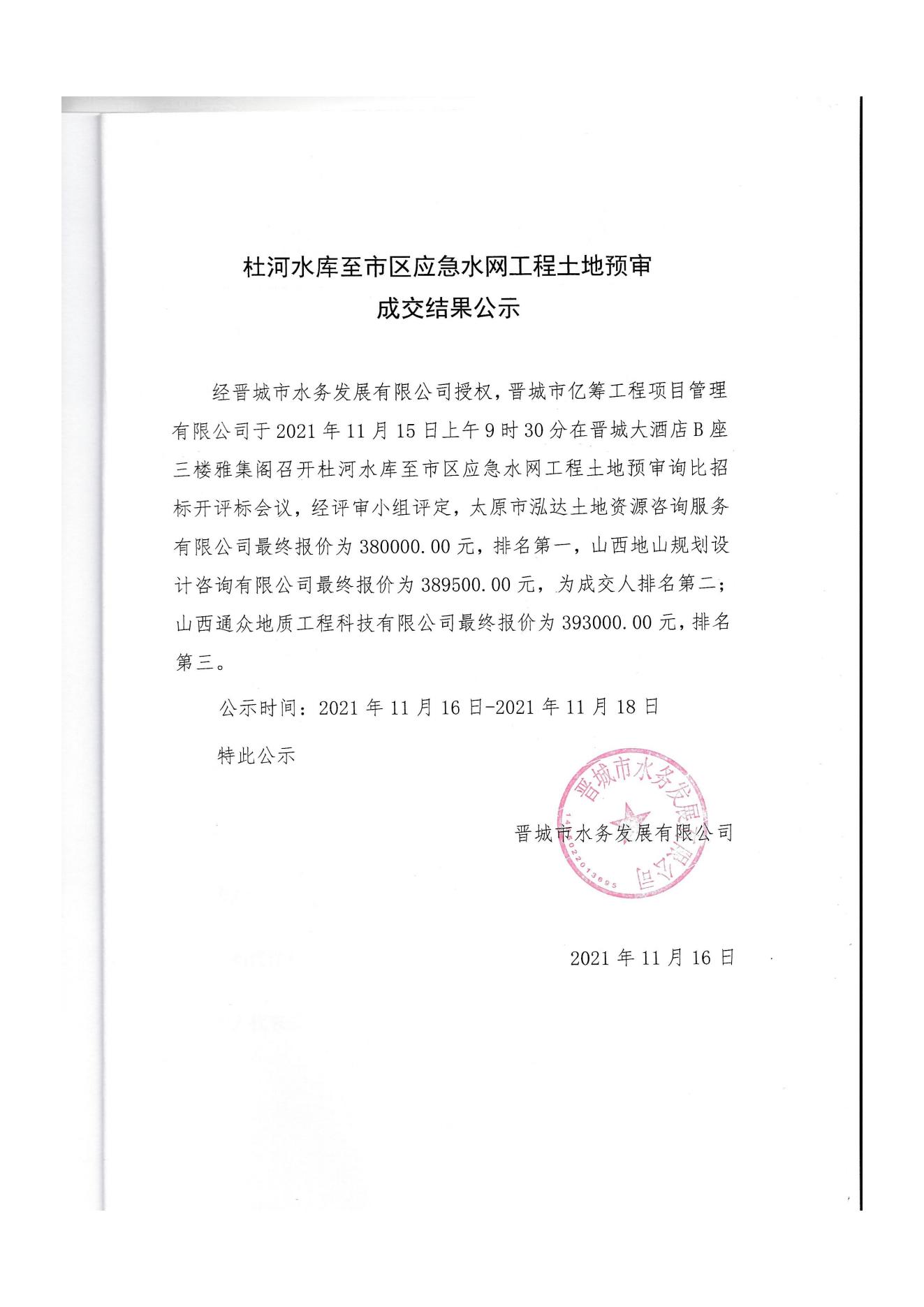 杜河水庫至市區(qū)應急水網(wǎng)工程土地預審成交結(jié)果公示